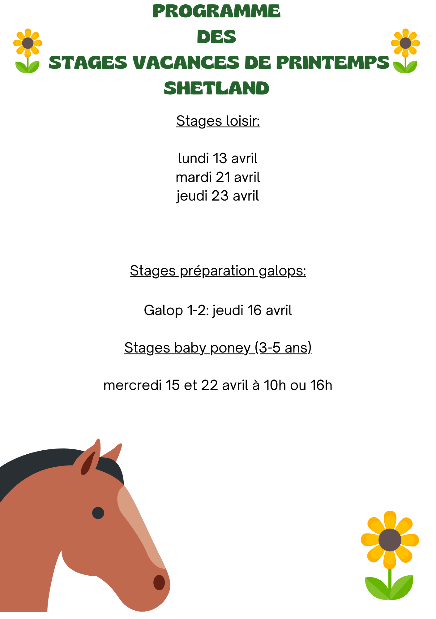Les stages loisir sont ouverts à tous, débutants bienvenus. Les stages shetland s’adressent aux enfants à partir de 6 ans, les stages double poney à partir de 11 ans. Les mini stages baby poney conviennent aux enfants de 3 à 5 ans